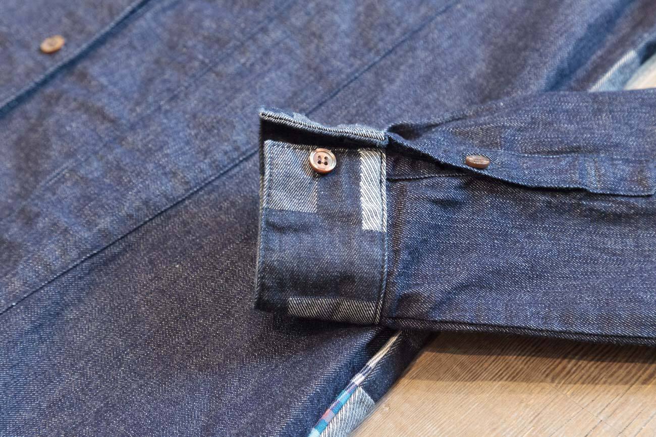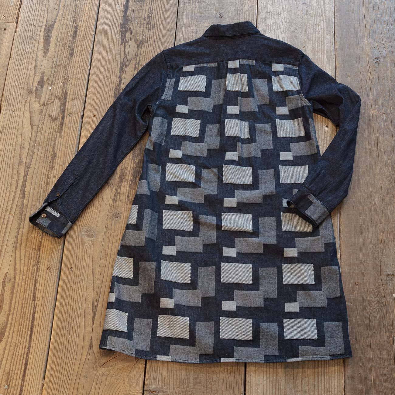 羽織用に使用できるシャツワンピースです。オリジナルのジャガードパッチワーク風デニムを使用して、8オンスのライトオンスデニムとのきりかえし