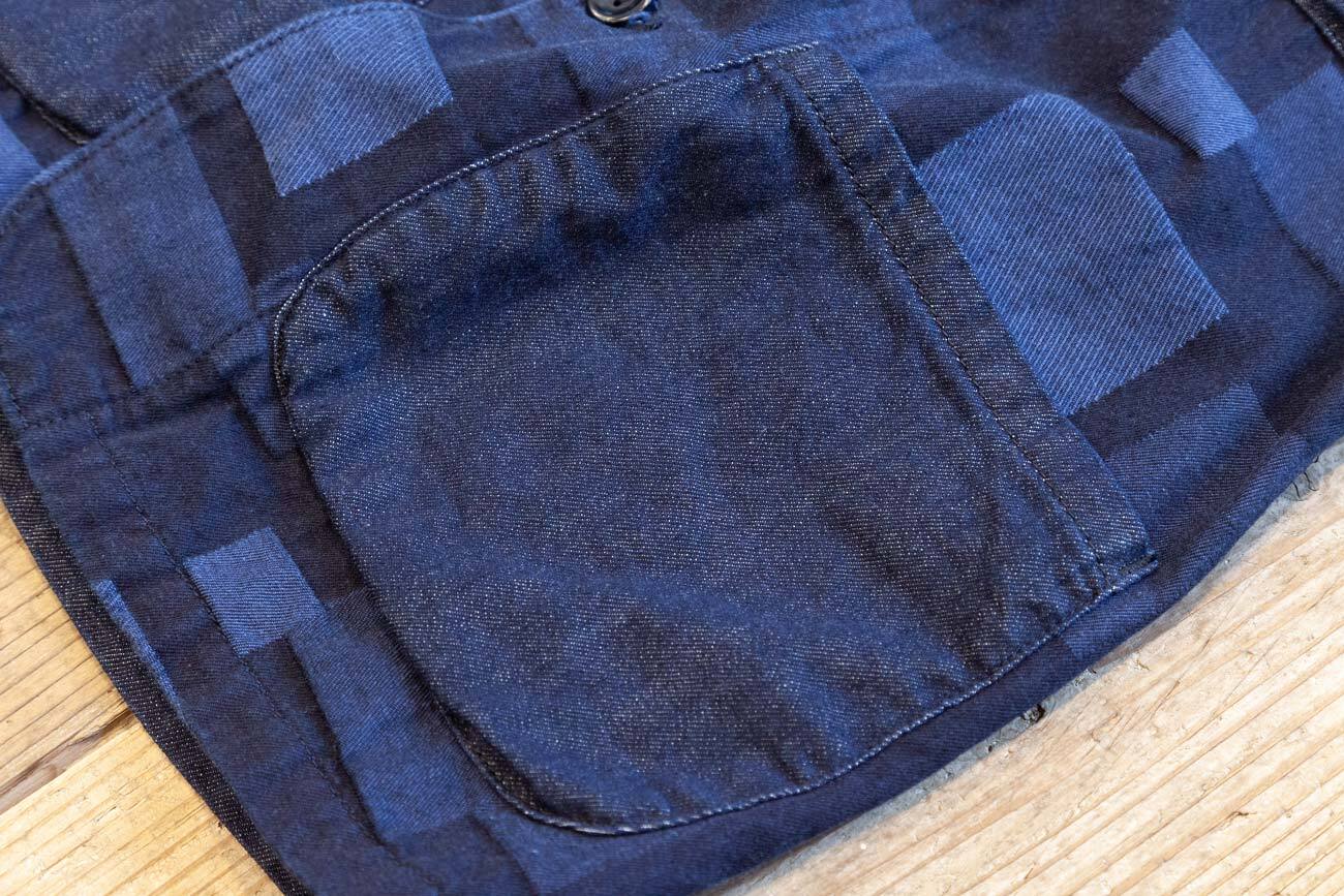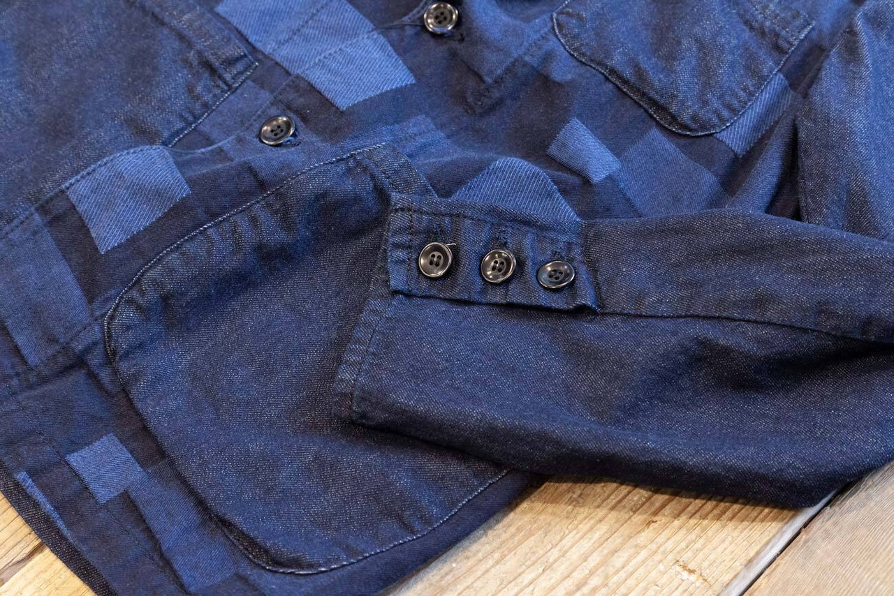 テーラードカラーのカバーオールです。オリジナルパッチワーク風デニムと8.5オンスのきりかえし。