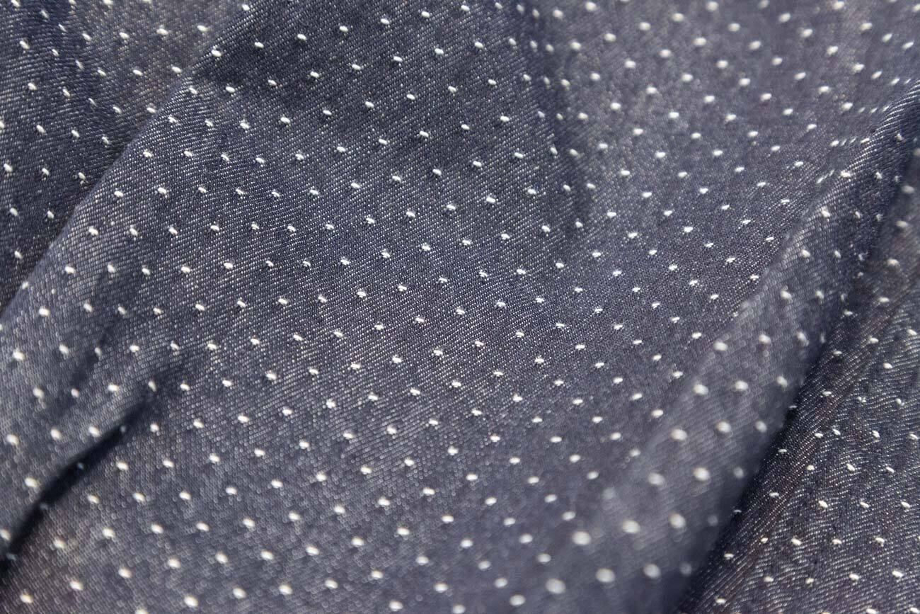 ゆったりシルエットのエッグパンツ。ピンドットデニム使用